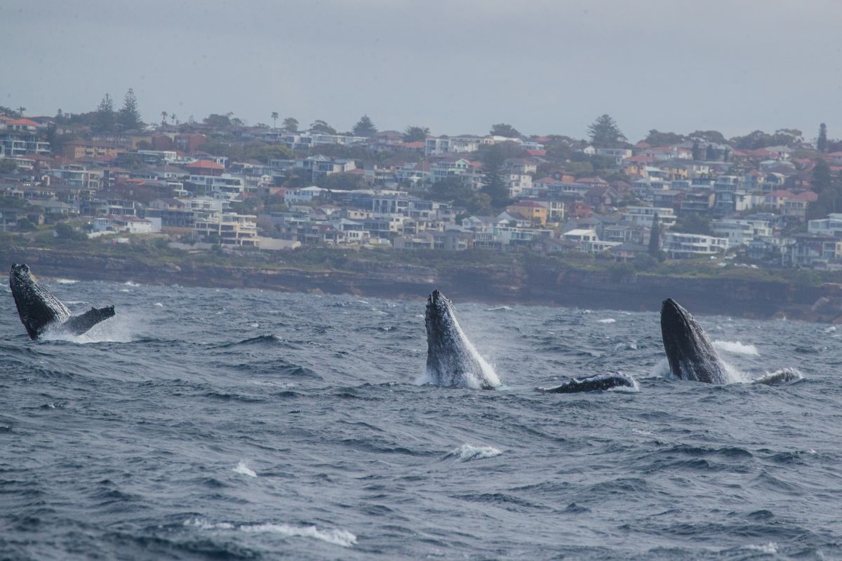 If that trip wasn’t enough, a quiet midweek discovery cruise may have given us the show of the season. We were tracking a pod heading south along the coast, with the wind whipping up and grey skies settling in over the late afternoon light. Off in the distance, we spotted splashes—and when we arrived, the scene left us gobsmacked. Potentially up to 20 separate whales were breaching, right off Bondi!